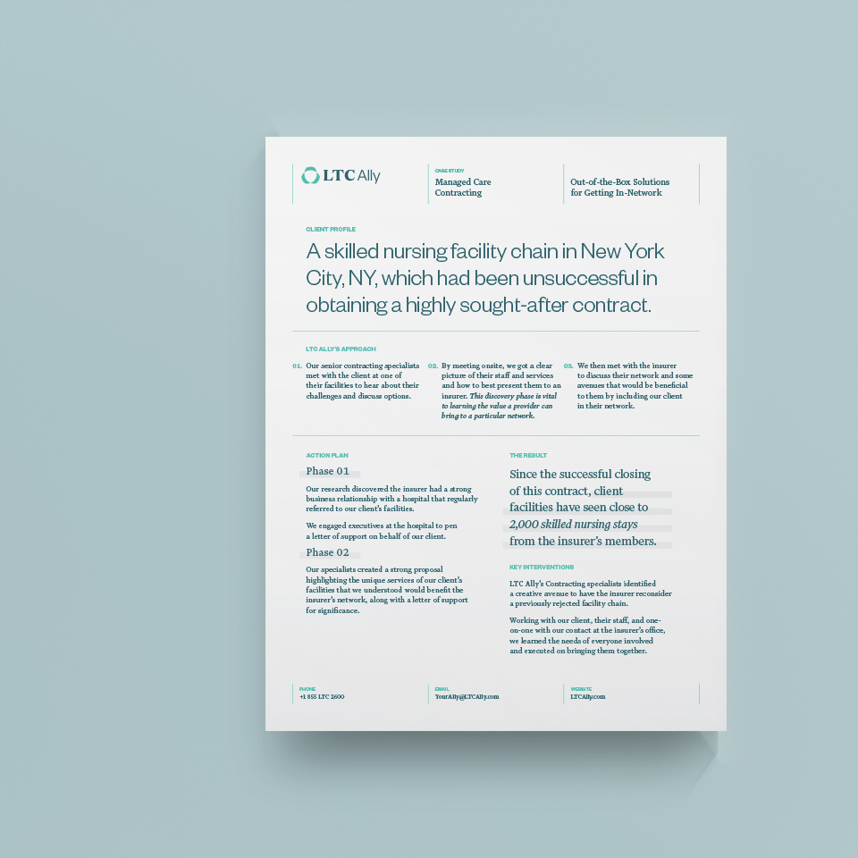LTC Ally has a 95% success rate in obtaining in-network contracts. In ¾ of these contracts, we increase rates and improve terms for facilities.